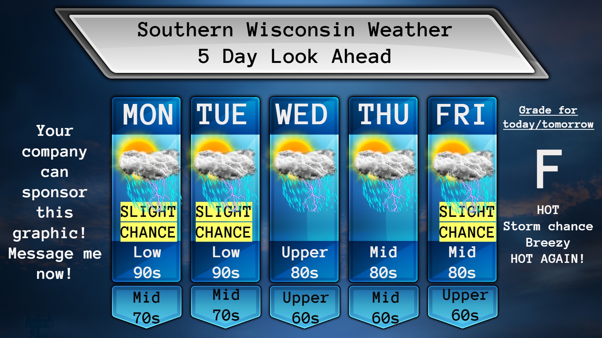 Good evening Wisconsinites! It’s going to feel more like Texas or Florida for the next few days, but the heat doesn’t really retract much through next weekend. Tonight we will be cloudy, but then some clearing is possible. That won’t help us out much with temps only dropping to the low 70s. South winds 8-13mph.