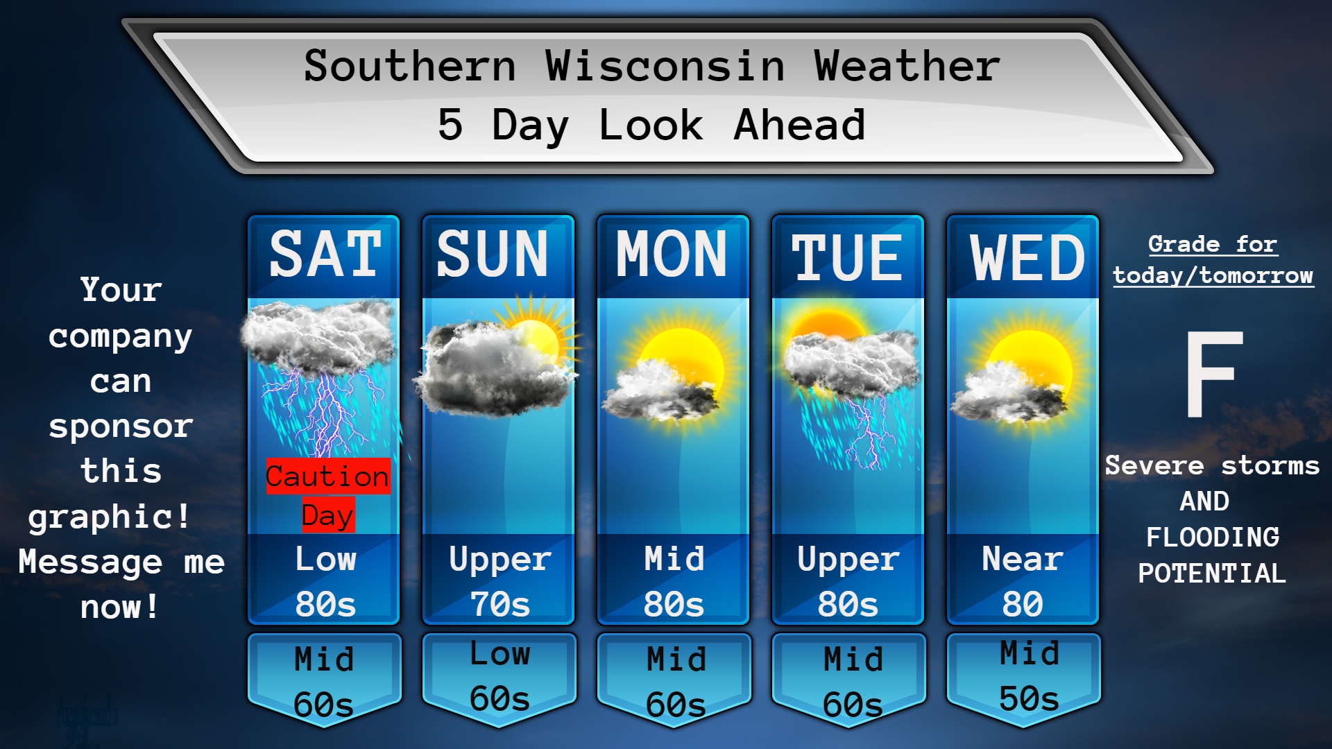 Tomorrow morning should be dry and that should be the case until the afternoon. Once we get to the mid to late afternoon hours things will go downhill. If we can tap into some sunshine, then temps will be in the mid 80s. If it stays cloudy, then the low 80s are possible. Temps will be highly dependent on where the warm front sets up and how much sunshine we see. The warm front will also be the factor on strong to severe storms to erupt Saturday afternoon into Saturday night. The severe threat would be central WI down to northern IL. Storms will fire up along or near that front and then a line of severe storms will roll through with time. All modes of severe storms will be possible along with flooding rains. Tomorrow afternoon and evening will NOT be the time for the picnic. If you have plans outside PLEASE stay on high alert on the weather. If that warm front pops north and we get some sunshine, you better bet that the storms will be nasty. Storm chances will end by midnight and it will remain cloudy with lows in the mid 60s. SW to NW winds 7-12mph with the passage of the cold front. Below is a photo of the flood watch!
