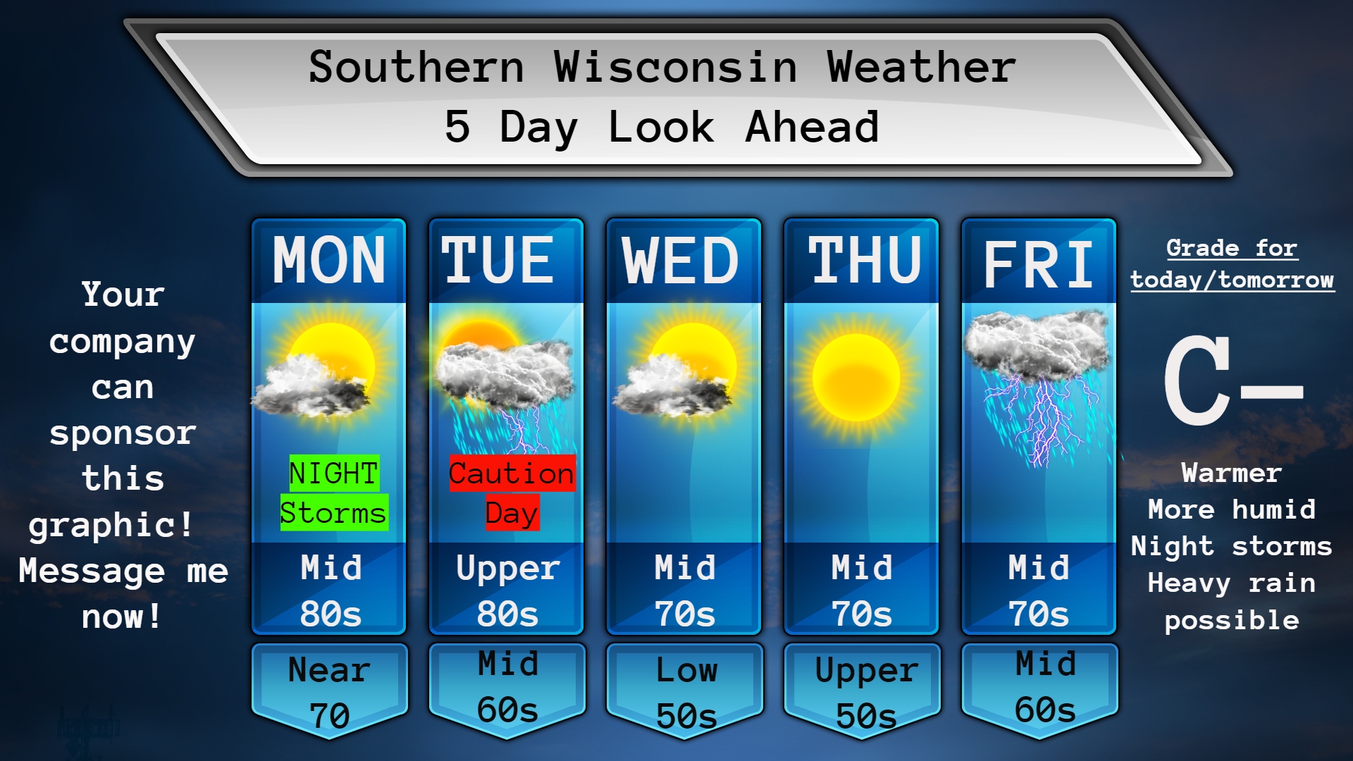 Tomorrow actually looks dry for Southern Wisconsin. I peeked at the hires NAM this morning and it’s not showing much of anything. I will keep an eye on it though. We’re still going to be sunny and hot with temps near 90 degrees. SW to West winds 7-12mph. A couple clouds at night with temps in the mid 60s and light winds.