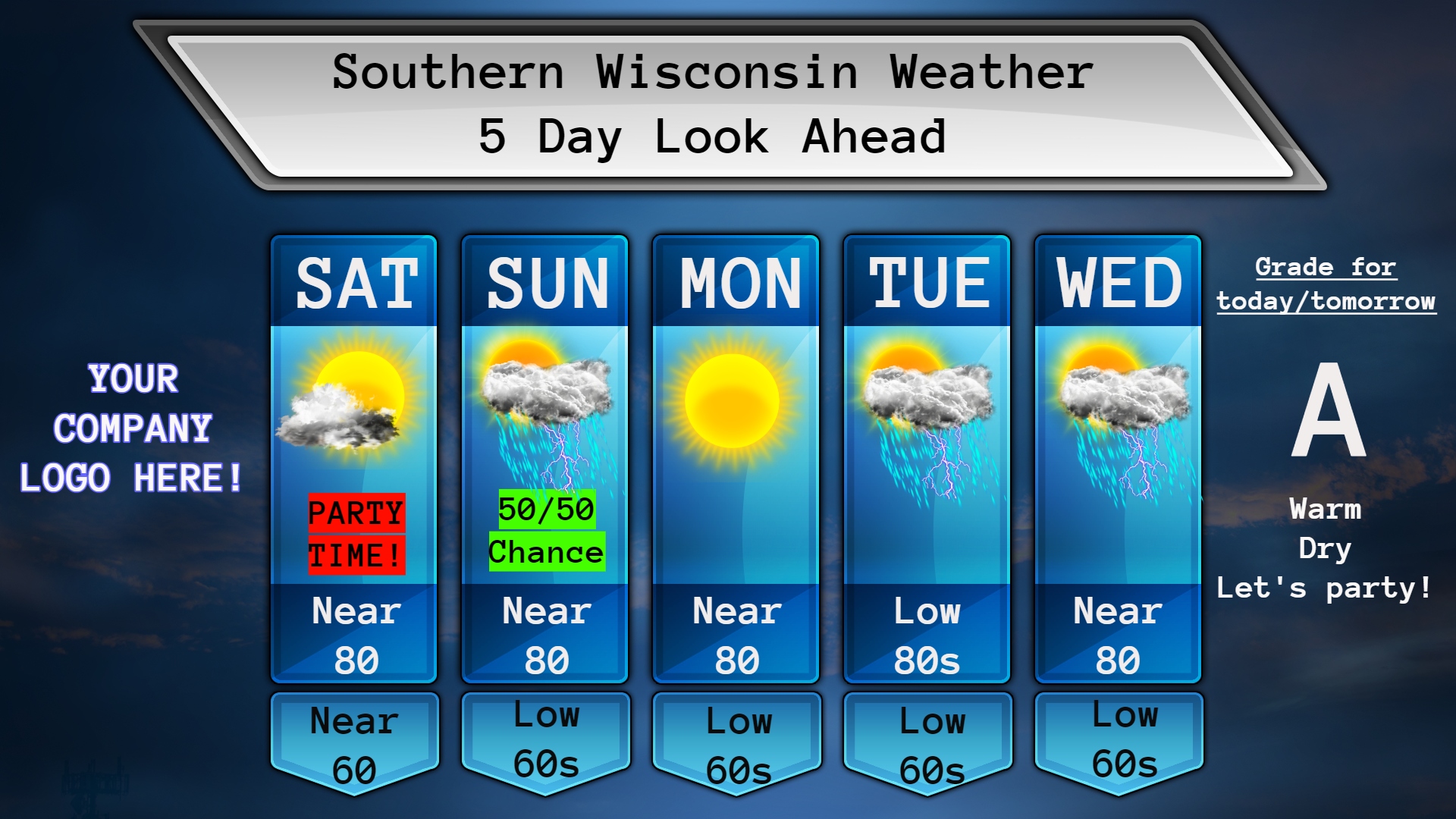 Good morning Wisconsinites! Happy Saturday! Today is party day! We should see a mix of sun and clouds today with temps near 80. Light winds. A couple clouds tonight with temps in the low 60s and calm or light winds.