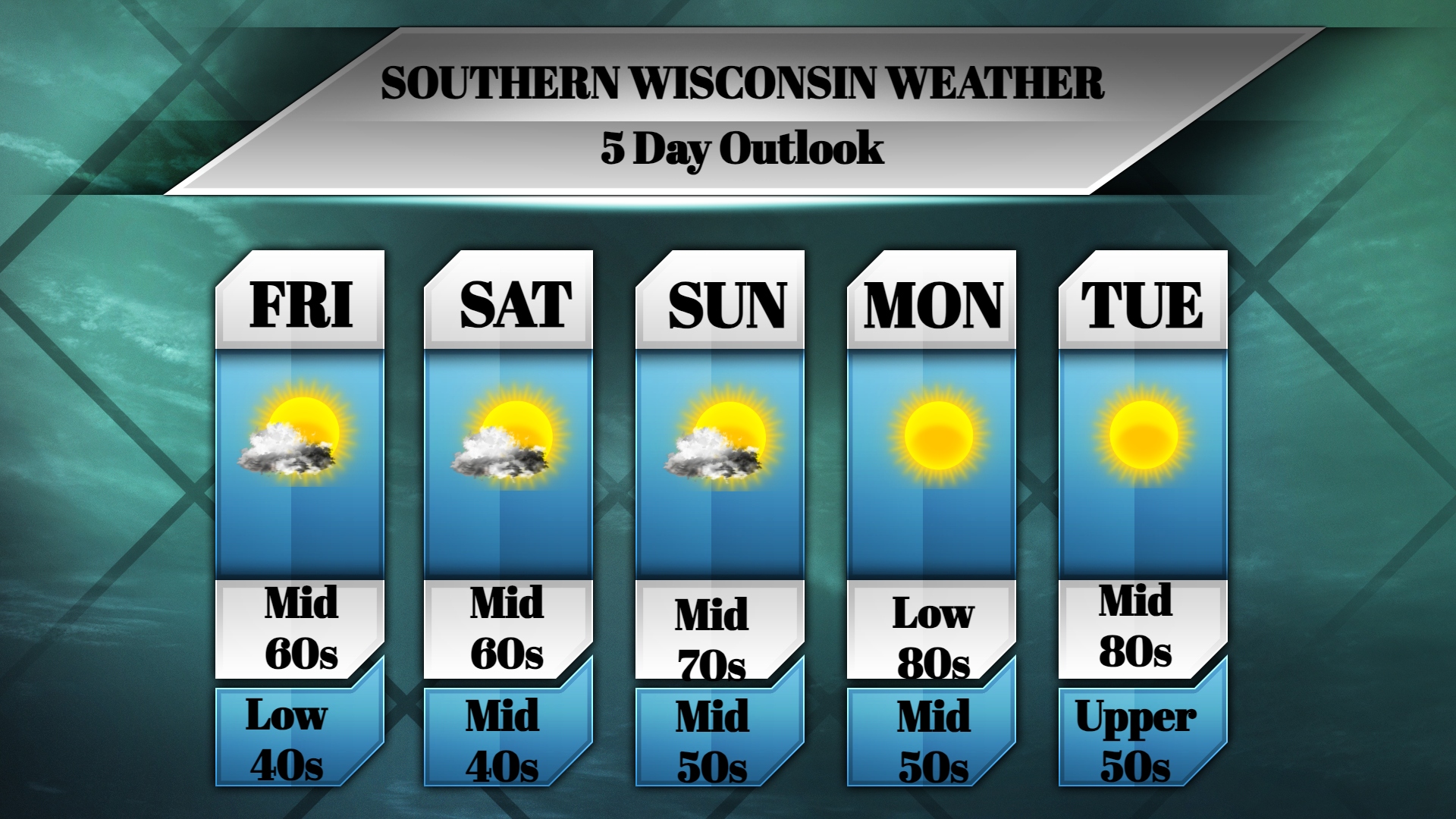 Good evening Southern Wisconsin! Well over the next several days we will have some Fall like temps to tease us, then warmer temps as we get into next week. Tonight we will see a few clouds and temps in the mid 50s. North winds 4-9mph.