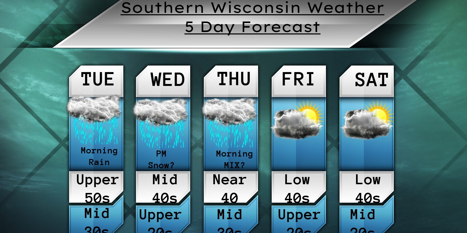 A chance of snow or mix Thursday morning and highs on Thursday will be in the low 40s. NW winds 16-21mph with gusts to 25-30mph. Most of the day should be dry. Cloudy at night with temps in the mid 30s. NW winds 16-21mph with gusts to 25-30mph.