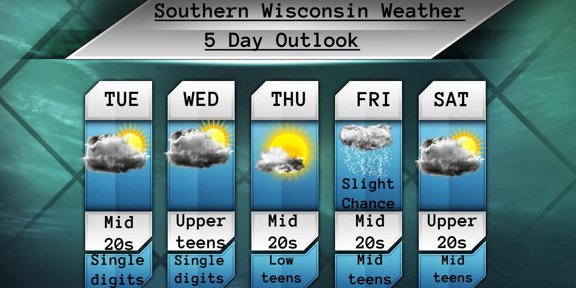 Cloudy on Sunday with another slight chance for some snow showers. Same with Sunday night. Highs in the upper 20s and lows in the upper teens.