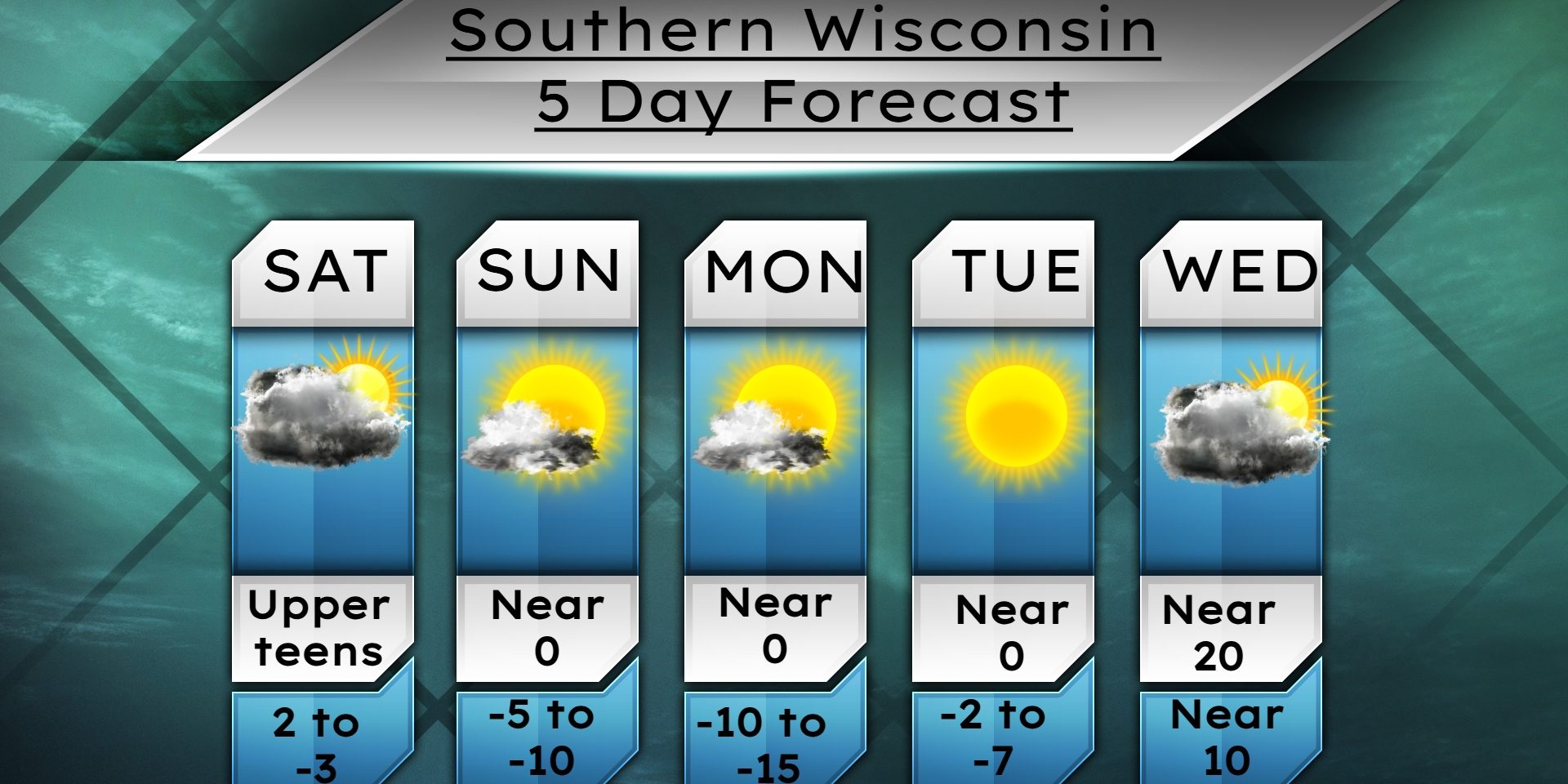 Sunny and very cold on Sunday with highs 0 to 5 degrees. Probably closer to 0 though. NW winds 11-16mph. A couple clouds possible at night and very cold still with temps dropping to -5 to -10 degrees. NW winds 11-16mph.