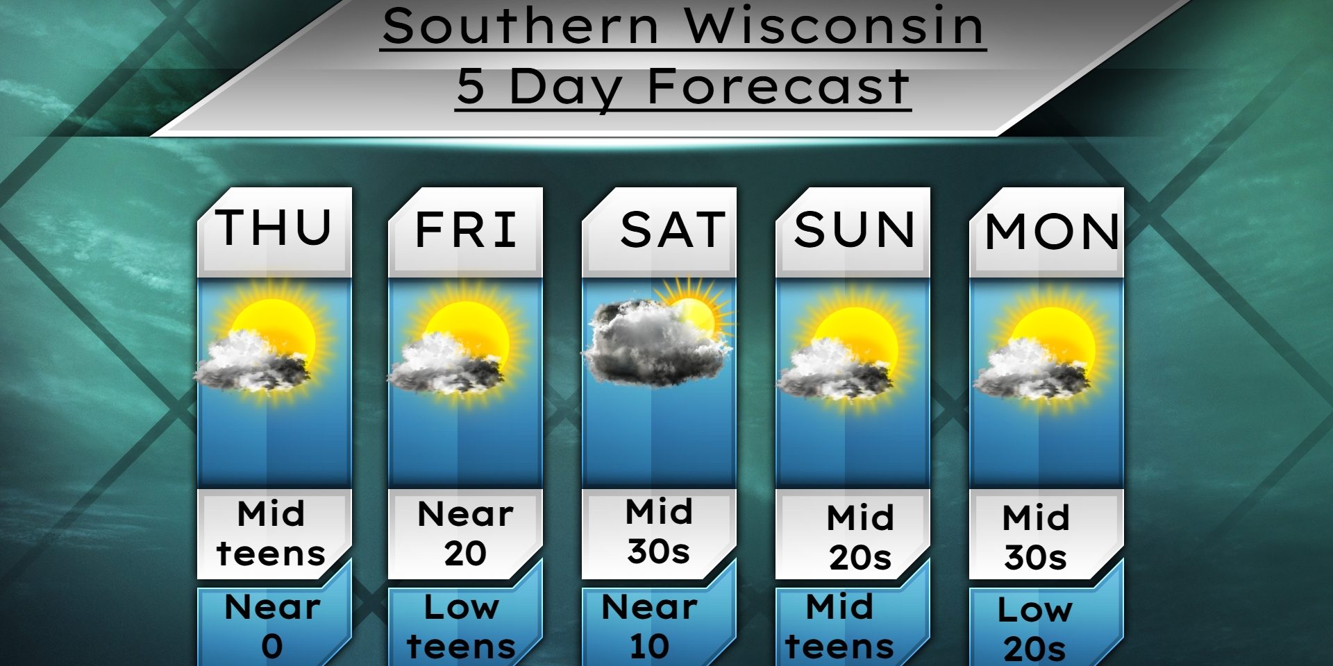 Sunny to start your Friday, then we will see more clouds move in as the day progresses. Highs will be near 20. SW winds 4-9mph. Cloudy at night with maybe a couple flurries, but no issues are expected. Lows in the mid teens. South winds 4-9mph.