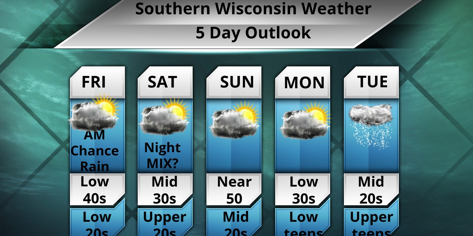 Good morning friends of Wisconsin! Happy Friday! We have some really thick fog out there this morning, but mainly confined to the bottom 2 tiers of counties. That’s where a dense fog advisory is in place until 9am. The winds are helping with some of the fog. There’s also a slight chance for some sprinkles within those counties from a system to the south. Temp is currently 34 degrees, so I don’t think there’s any freezing going on, but please just take it easy this morning. We could see some sunshine this afternoon with temps in the low 40s. North winds 11-16mph with gusts to 25-30mph. A couple clouds tonight with temps in the low 20s. NE winds 11-16mph.