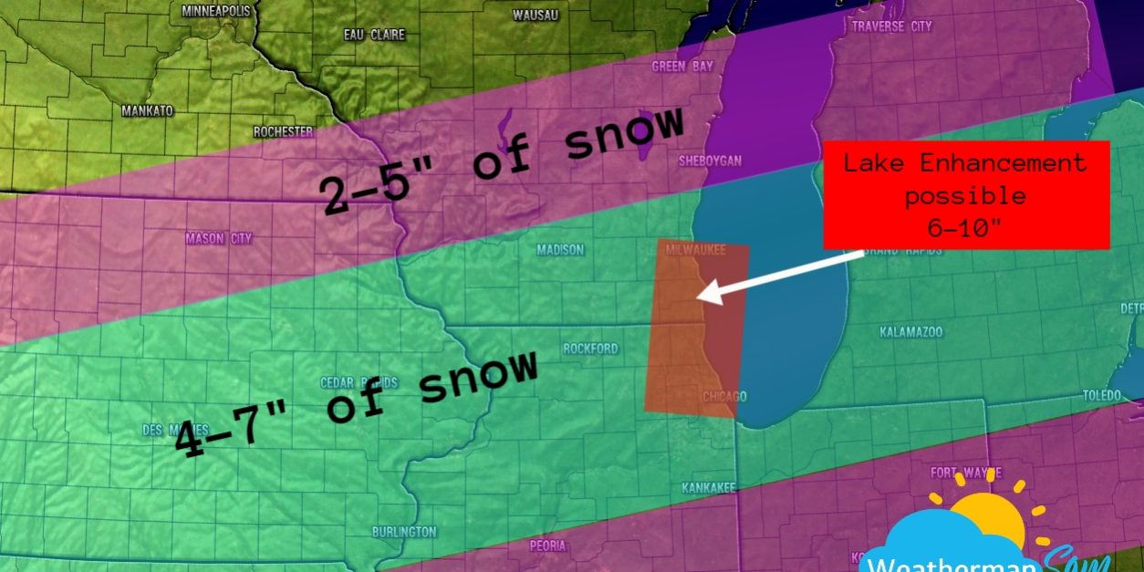 Wednesday we are watching for the potential for a significant snowstorm for Southern WI and Northern IL. Snow might be heavy at times and will begin by mid to late morning. Highs in the low to mid 20s. This will be a colder more fluffy snow. North winds 6-11mph. Snow will continue into the evening with it ending by midnight. Lows will dip to the single digits. NE to NW winds 8-13mph. Snow totals for most of the area will be 4-7″ with higher amounts near the lake and south of MKE.