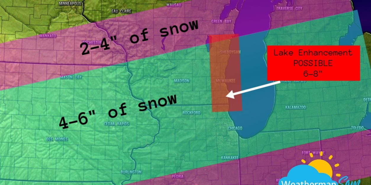 Good morning Wisconsinites! Happy hump day! Snow should break out around Southern Wisconsin by 9-10am and maybe a tickle later for areas to the NE. Snow may get heavy during the afternoon and early evening hours. Snow should wrap up by midnight or so. Highs today will be in the upper teens to near 20 degrees. We will see a cold snow which will mean higher snow ratios. 4-6″ looks great for most areas and 6-8″ for the lakeshore counties that see lake enhancement snows. NE winds today of 4-9mph with a couple higher gusts possible. North winds 11-16mph tonight, so blowing and some drifting back onto the roads is likely. Temps will drop to the single digits, so road salt will be very hard to activate.