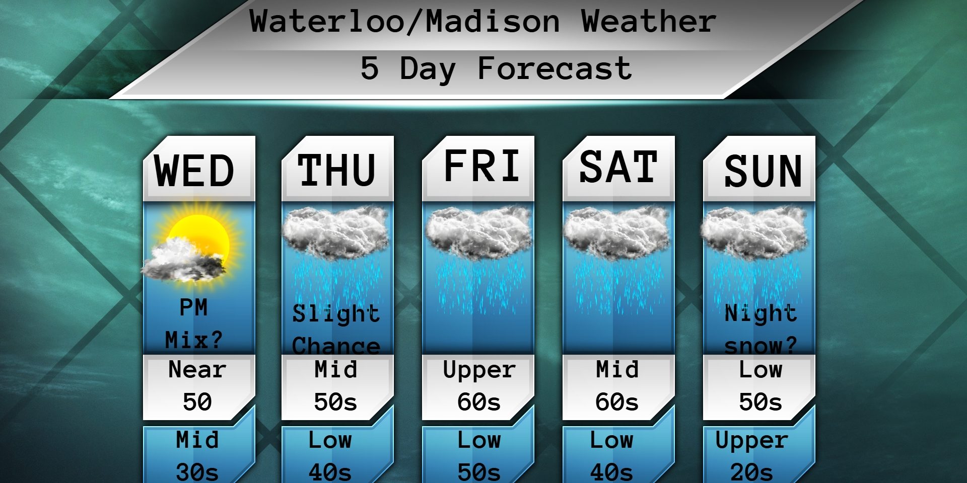 Good morning Wisconsinites! Happy hump day! Today we should become mostly sunny after some morning clouds. There could also be a flurry out there early. Temps should make it to the low to mid 50s. West winds 4-9mph. Cloudy tonight with a chance for some rain showers. Temps will dip to the mid to upper 30s. No mix is expected now.
