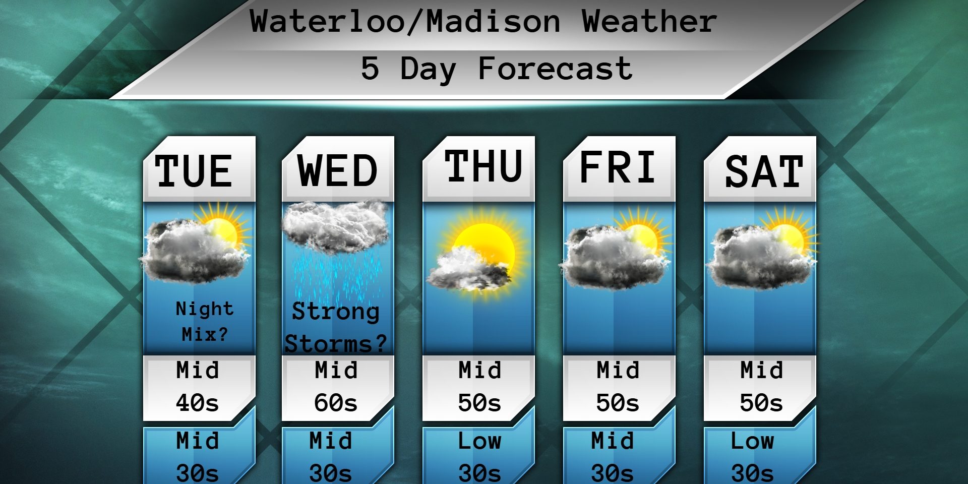 Good morning Southern Wisconsin! We should see some sunshine early today, then clouds. A mix or snow will move in later this afternoon and into the evening. 1″ or less of snow will be possible north of Madison to Milwaukee. Temps will be in the low to mid 40s, so some melting will occur as it falls. Snow will change to rain this evening and no issues on the roads once the changeover happens. SE winds 11-16mph today and east winds 16-21mph with gusts to 25-35mph tonight. Some thunderstorms are possible later tonight. Lows in the mid 30s.