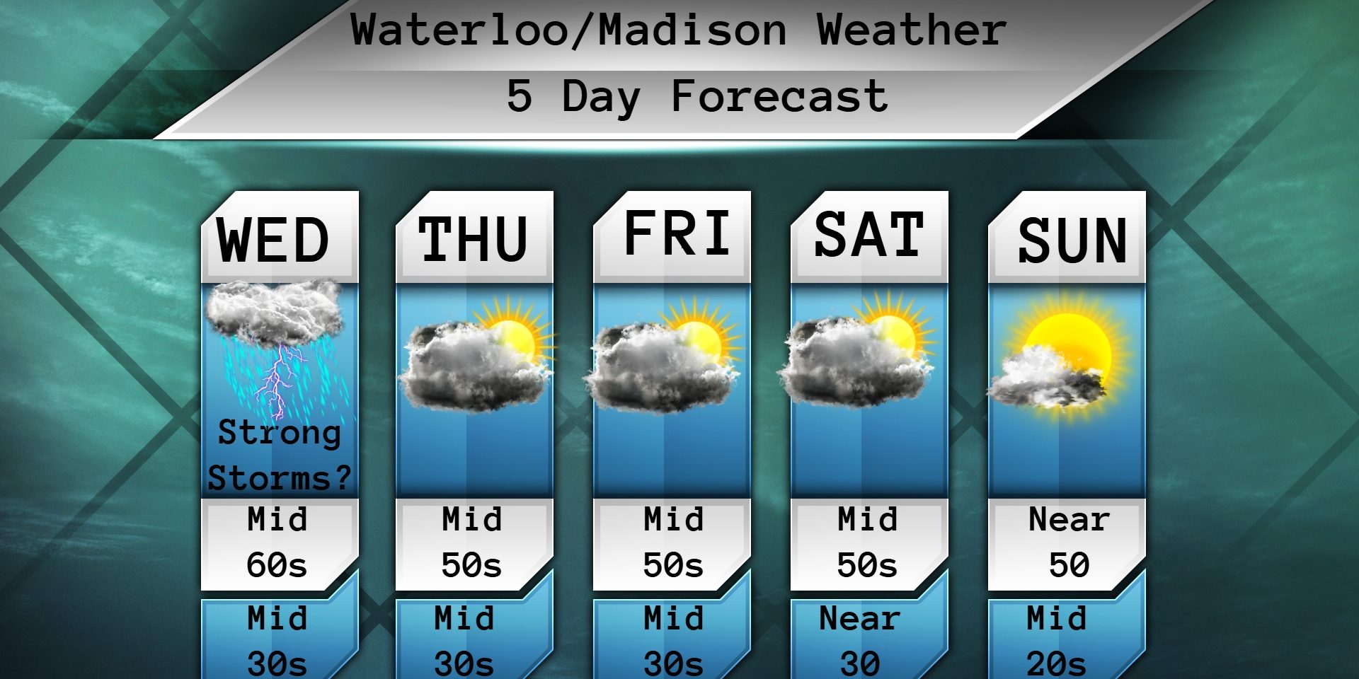 Rain will end in the morning I think, but I think we stay cloudy all day which would lessen the chances for severe weather. If we can tap into some sunshine, then it’s a different story. Highs will be in the low to mid 60s. SE to south winds 16-21mph with gusts to 30-35mph. A couple clouds at night and cooler with temps in the mid 30s. West winds 11-16mph.