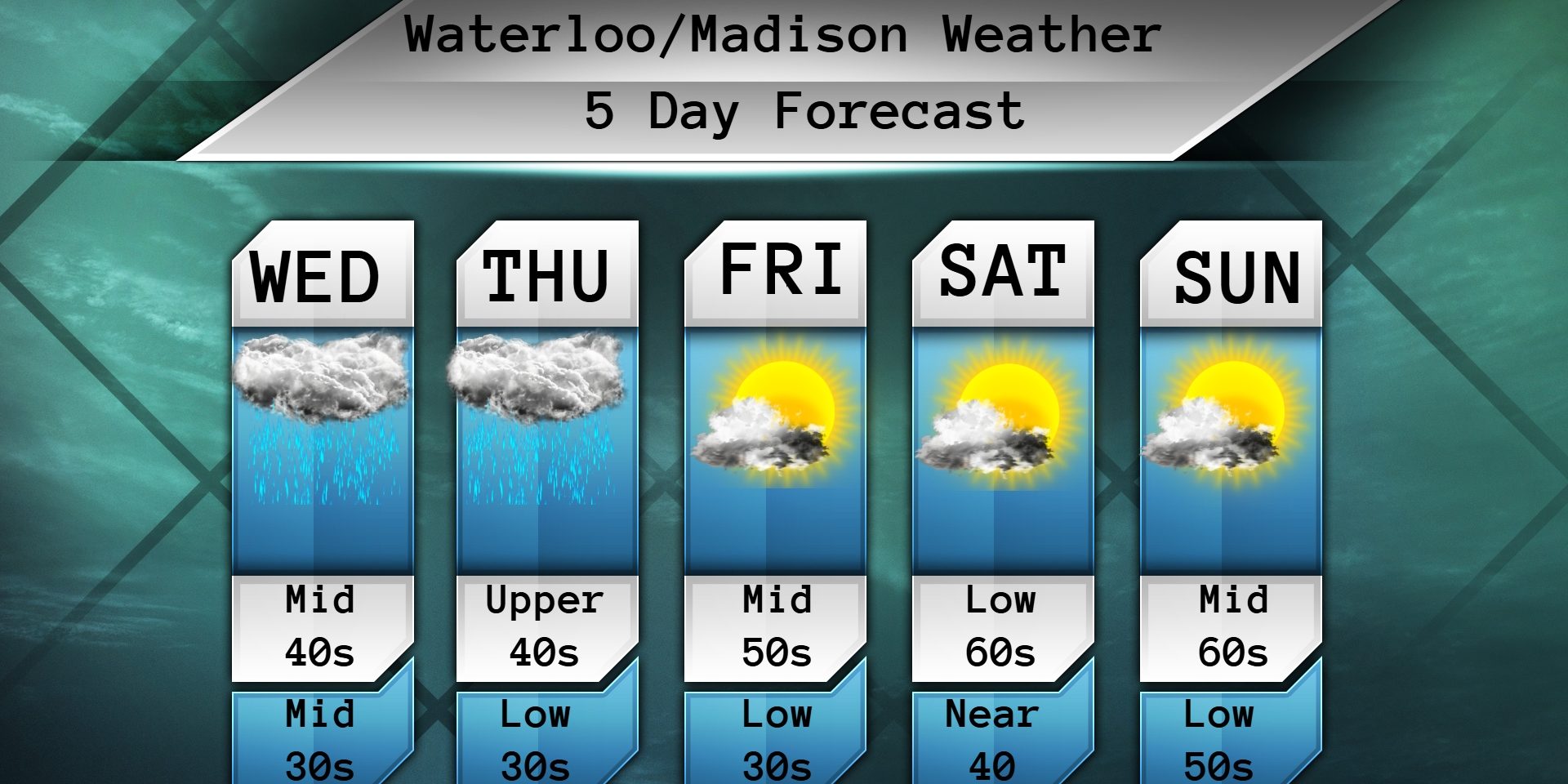 Good morning Wisconsinites! Happy hump day! Rain will move in at some point today. Rain will changeover to snow for some folks in SE WI. A little accumulation is possible on elevated surfaces. Highs today will only reach the low 40s. South winds 4-9mph. Rain and snow showers may continue this evening, but then change back to rain late. Temps tonight in the mid 30s. Light winds.