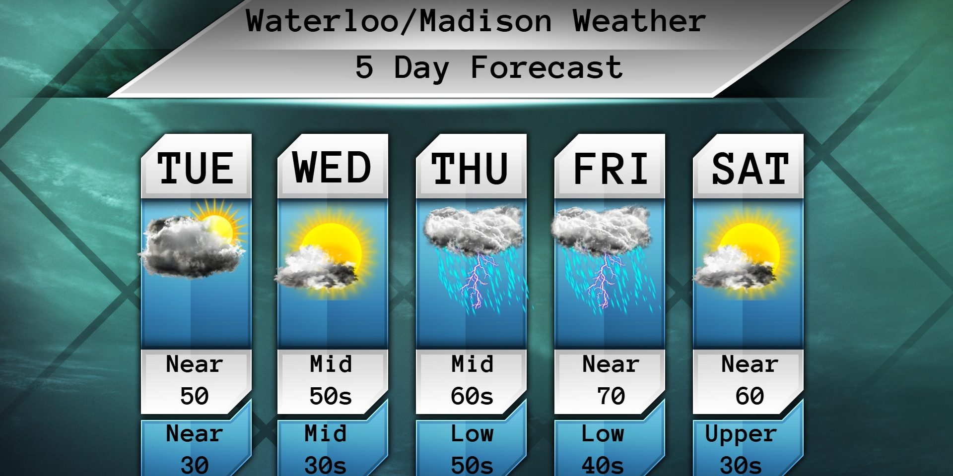 Good morning Southern Wisconsin! The showers that we had overnight are moving out this morning. Rainfall amounts were light. We had 0.11″ here in Waterloo. We should become sunny today with temps near 50 degrees. NW winds 16-21mph with gusts to 25-30mph. Clear and cool tonight with temps in the mid to upper 20s. NW winds 8-13mph.
