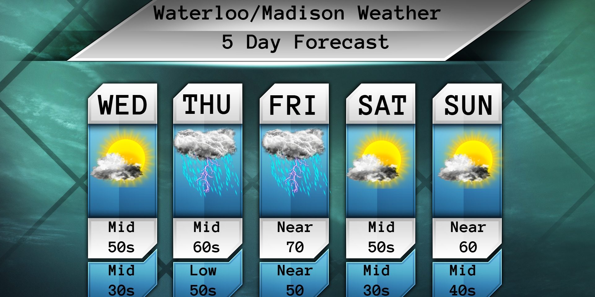 Showers and storms are likely Friday and some of these could be strong to severe. Temps near 70 degrees. South to west winds 7-12mph. Slight chance for storms in the evening with lows near 40 degrees. NW winds 4-9mph.