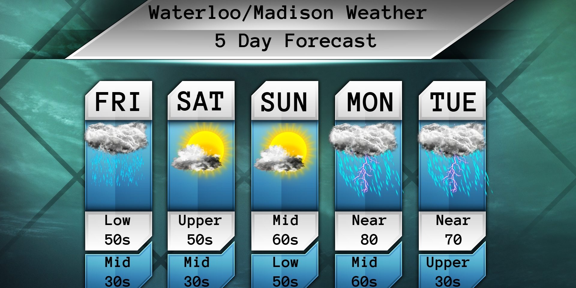 Good morning friends of Wisconsin! Happy Friday! Showers and storms are likely this morning, then they will start to taper off this afternoon. Temps today will only get up to about the low 50s. NE winds 7-12mph. Clouds will clear out overnight with temps in the mid 30s. North winds 7-12mph.