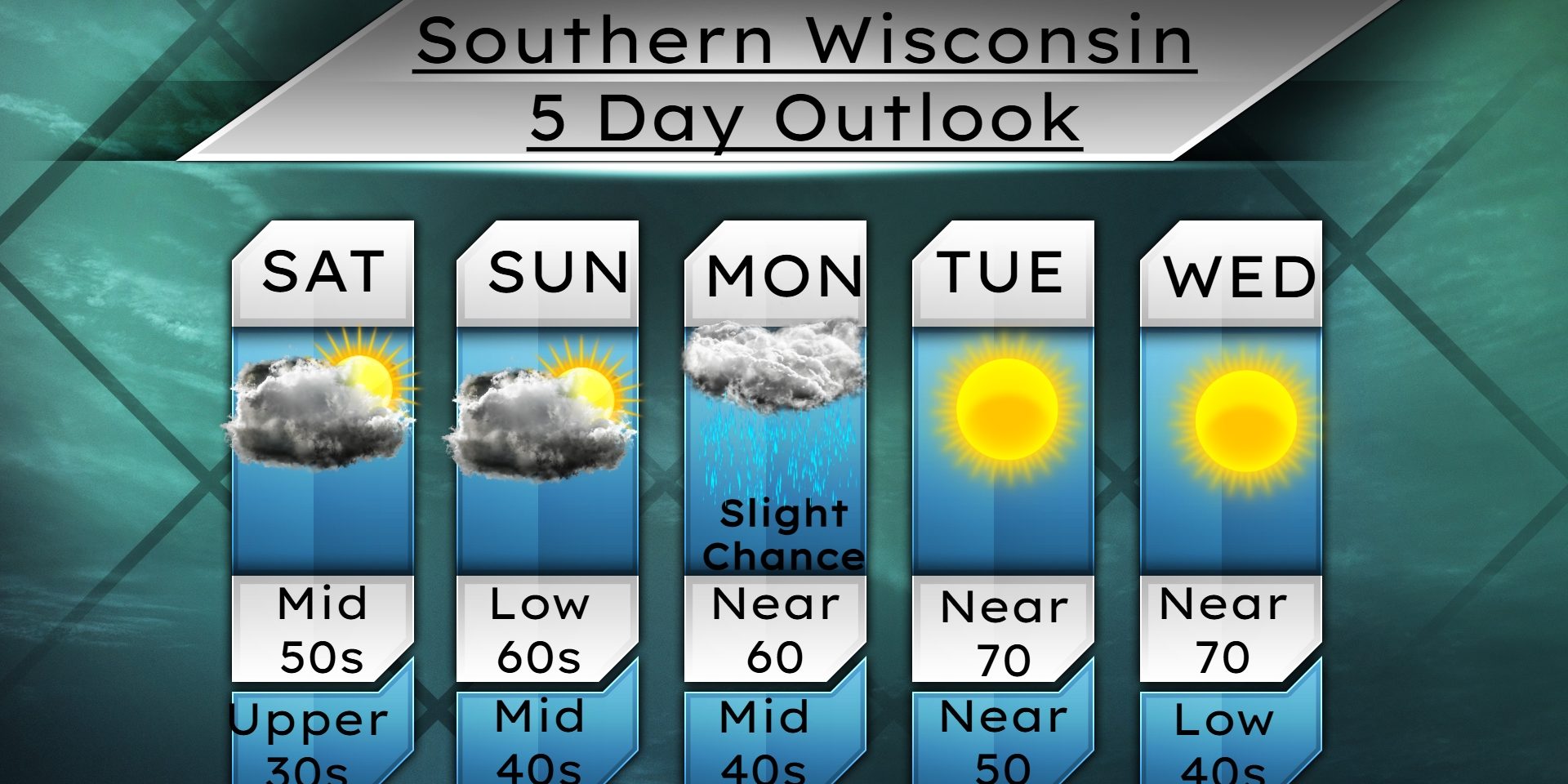 More clouds than sunshine on Sunday with temps in the low 60s. Those temps could rise if we see more sunshine though. NE winds 4-9mph. Cloudy with a slight chance for showers late Sunday evening with temps dropping to the mid 40s. NE winds 4-9mph.