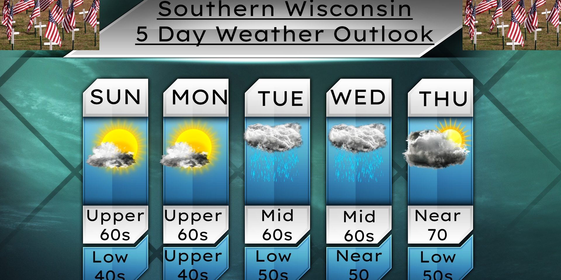 Memorial Day is shaping up to be sunny and mild with temps in the mid to upper 60s with east winds 4-9mph. Clouds to roll in at night with temps in the upper 40s and light winds.