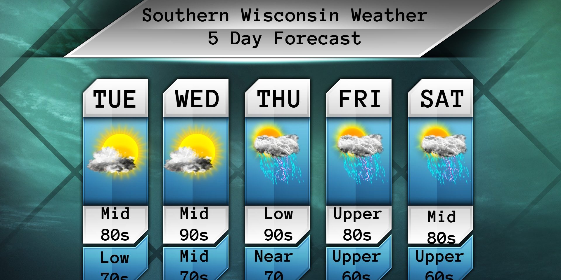Good morning Southern Wisconsin! Today is when the heat starts to build into the area. Temps will reach the mid 80s and the dewpoints will be on the rise as well. Clouds this morning should lead to sunshine this afternoon. A couple clouds tonight with a chance for some storms towards morning with muggy temps in the low 70s. South winds 7-12mph.