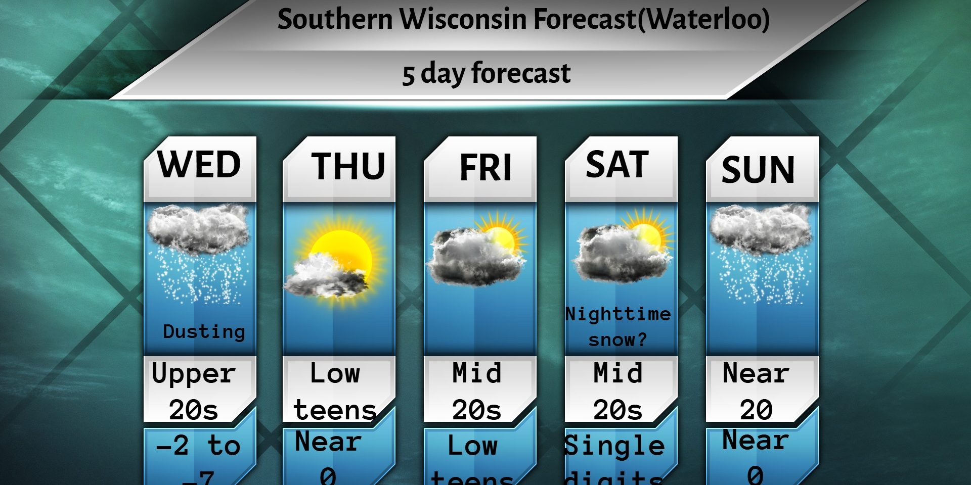 Good evening Southern Wisconsin! Tonight we will remain cloudy with temps near 20 SW winds 7-12mph. Light snow is possible either late tonight or very early in the morning. SW winds 11-16mph.