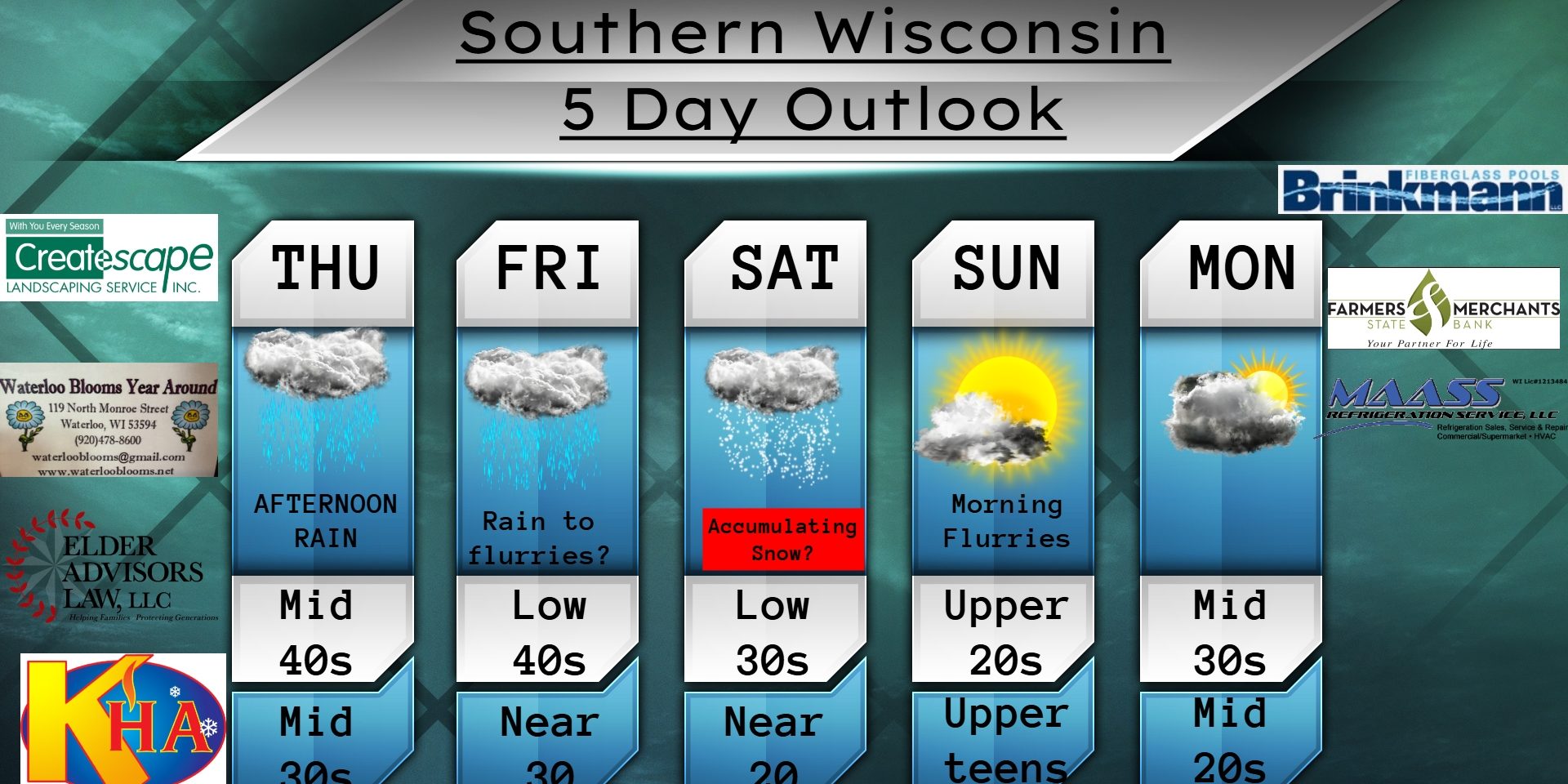 This Wednesday evening forecast is sponsored by Createscape Landscaping Service, Inc. out of Mukwonago, WI. 262-662-0201, createscapeoffice@wi.rr.com , and www.createscapelandscaping.com