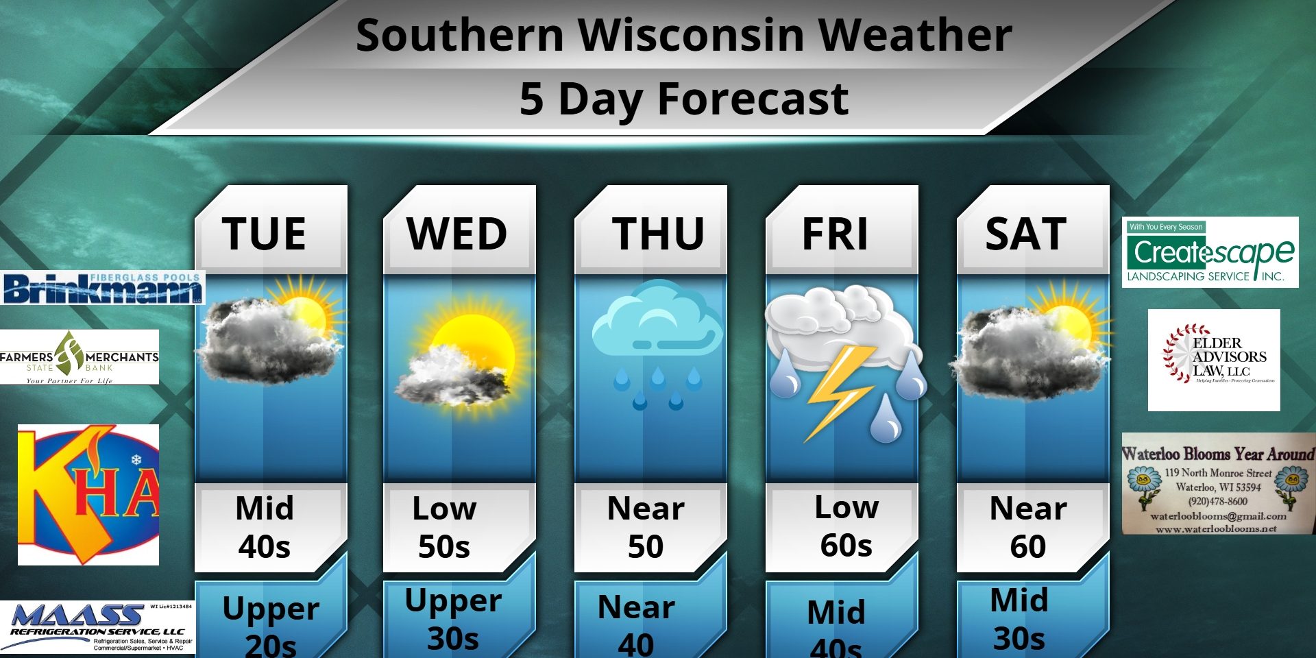 This Tuesday morning forecast is brought to you by Waterloo Blooms out of Waterloo, WI. WaterlooBlooms@gmail.com and 920-478-8600