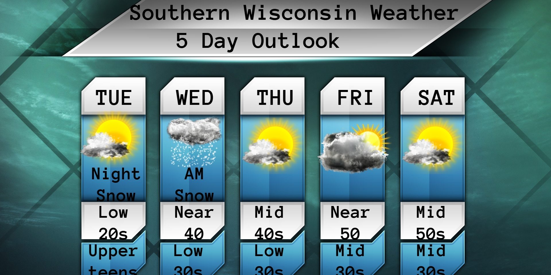 Snow likely tonight with temps in the mid teens. Most areas will see an inch, but we can’t rule out 2″ in areas SW of Madison. A weak clipper type system. South winds 4-9mph.