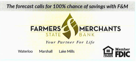 This Saturday evening forecast is sponsored by Farmers & Merchants State Bank! Waterloo is 920-478-2181. Marshall is 608-655-3451. Lake Mills is 920-630-5550. Contact them at https://www.fandmstbk.com/contact-us
