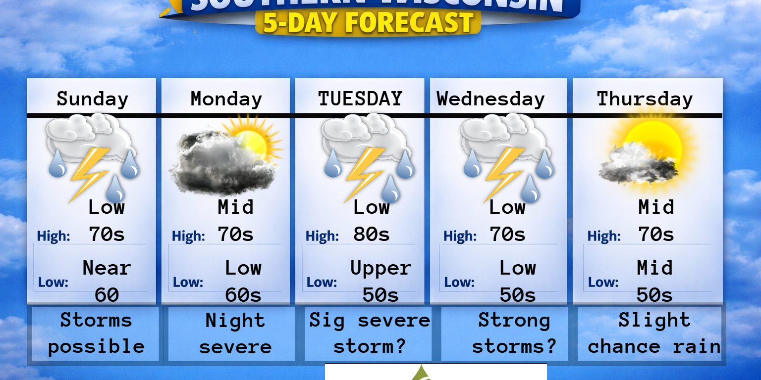 north of Madison. There is a threat for nocturnal tornadoes. So please go to bed with a plan and don’t sleep naked! SW winds 7-12mph.