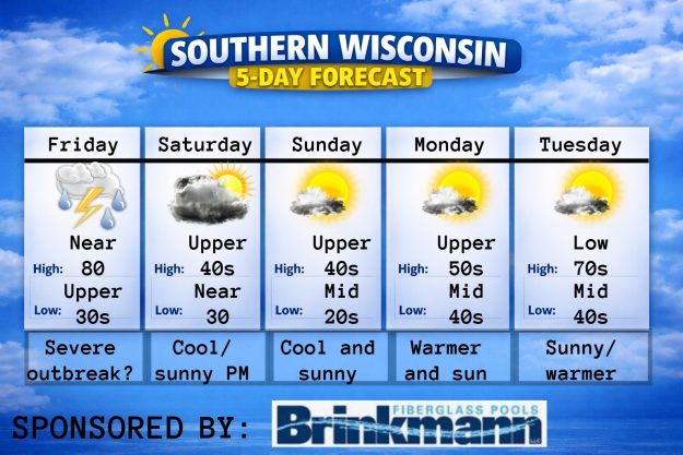 THE FORECAST CURRENT CONDITIONS IN WATERLOO, WI: TIME: 830am TEMP: 60 degrees DEWPOINT: 58 Degrees WINDS: SE 7-12mph CURRENT CONDITIONS: Sunny and getting moist TODAY: TEMPS: Near 80 WINDS: South 16-21mph with gusts to 35mph FORECAST: Sunshine with severe storms possible by late afternoon TONIGHT: TEMPS: Upper 30s WINDS: South to NW 13-18mph with…