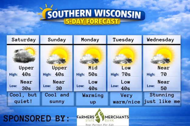 This Saturday morning forecast is sponsored by Farmers & Merchants State Bank! Waterloo is 920-478-2181. Marshall is 608-655-3451. Lake Mills is 920-630-5550. Contact them at https://www.fandmstbk.com/contact-us THE FORECAST CURRENT CONDITIONS IN WATERLOO, WI: TIME: 1015am TEMP: 40 Degrees DEWPOINT: 30 degrees WINDS: West 11-16mph with gusts to 30mph CURRENT CONDITIONS: Clouds and a little sun…