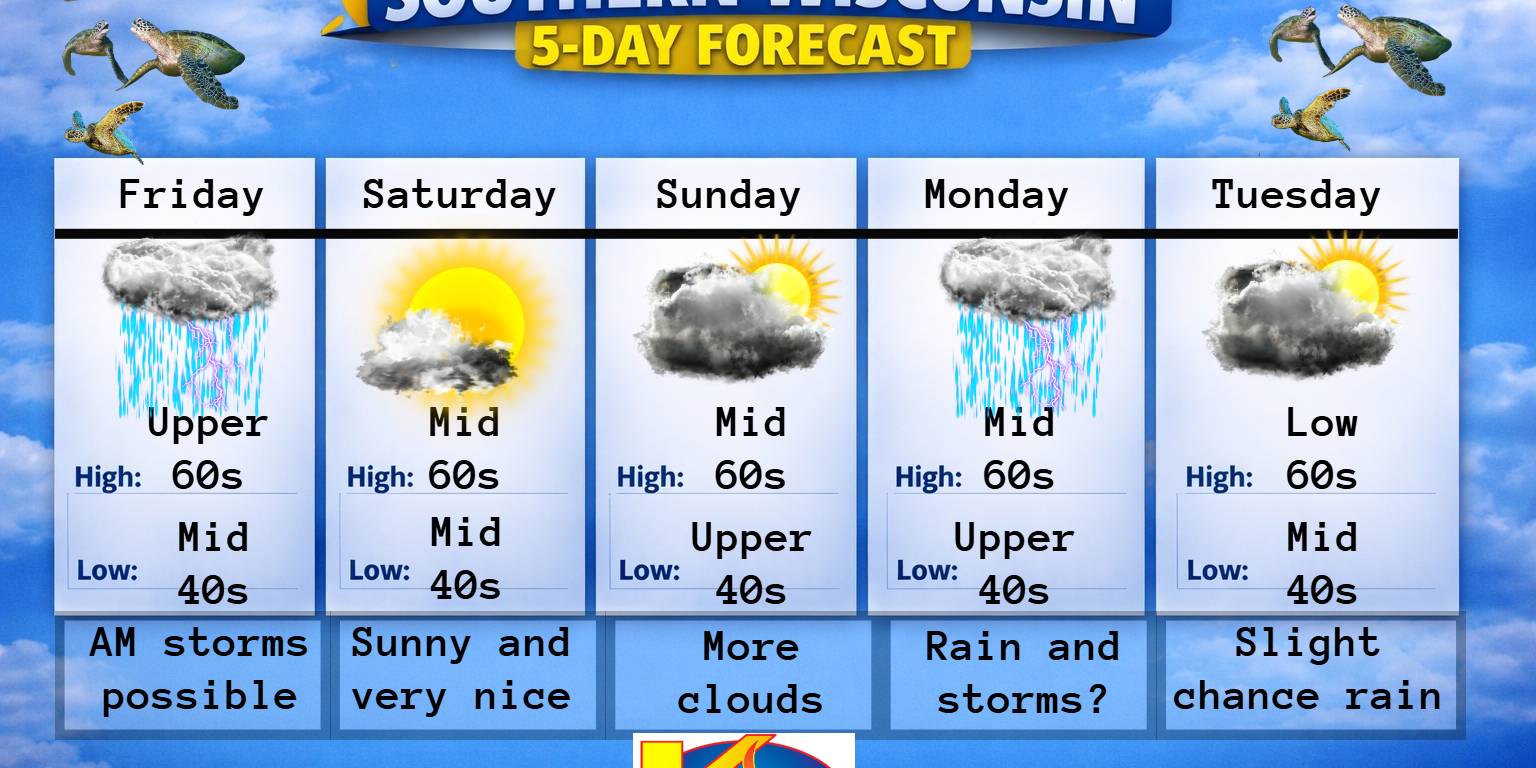 Good evening Southern Wisconsin! It’s pretty darn warm out there right now, but this is our last 80 degree day for at least the next week, so get out and get a tan after work! The rest of the afternoon will be dry and sunny, but some clouds will eventually filter in. Tonight we could see a broken line of showers and storms. The SPC has a slight risk for severe storms or level two for a very little sliver of SW Wisconsin, but the rest of us are under a marginal risk or level 1. The HRRR model has been pretty consistent with breaking up and even fizzling that line of storms around Madison. Some areas far west of Madison could see up to an inch of rain, while others well east of Madison could see 6 drops of rain. To me, the severe risk is west of Madison. The temps tonight will drop to the upper 50s with SW winds at 11-16mph.
