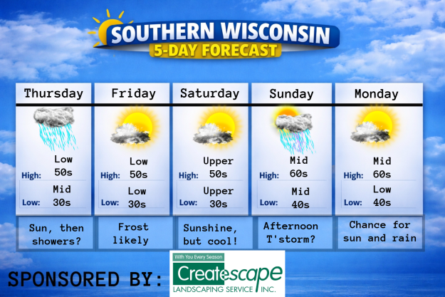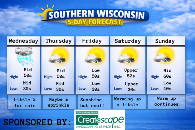 This Wednesday evening forecast is sponsored by Createscape Landscaping Service, Inc. out of Mukwonago, WI. 262-662-0201, createscapeoffice@wi.rr.com , and www.createscapelandscaping.com Help support my adventures here! THE FORECAST CURRENT CONDITIONS IN WATERLOO, WI: TIME: 330PM TEMP: 46 degrees DEWPOINT: 46 degrees WINDS: Light CURRENT CONDITIONS: Yucky TONIGHT: TEMPS: Mid 30s WINDS: NW 4-9mph FORECAST: Clearing likely,…