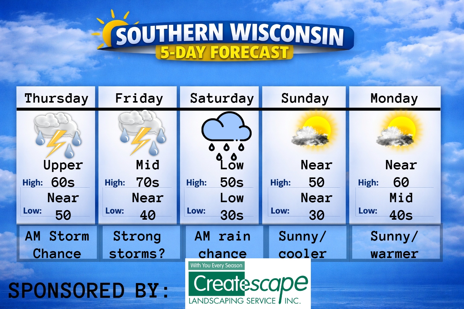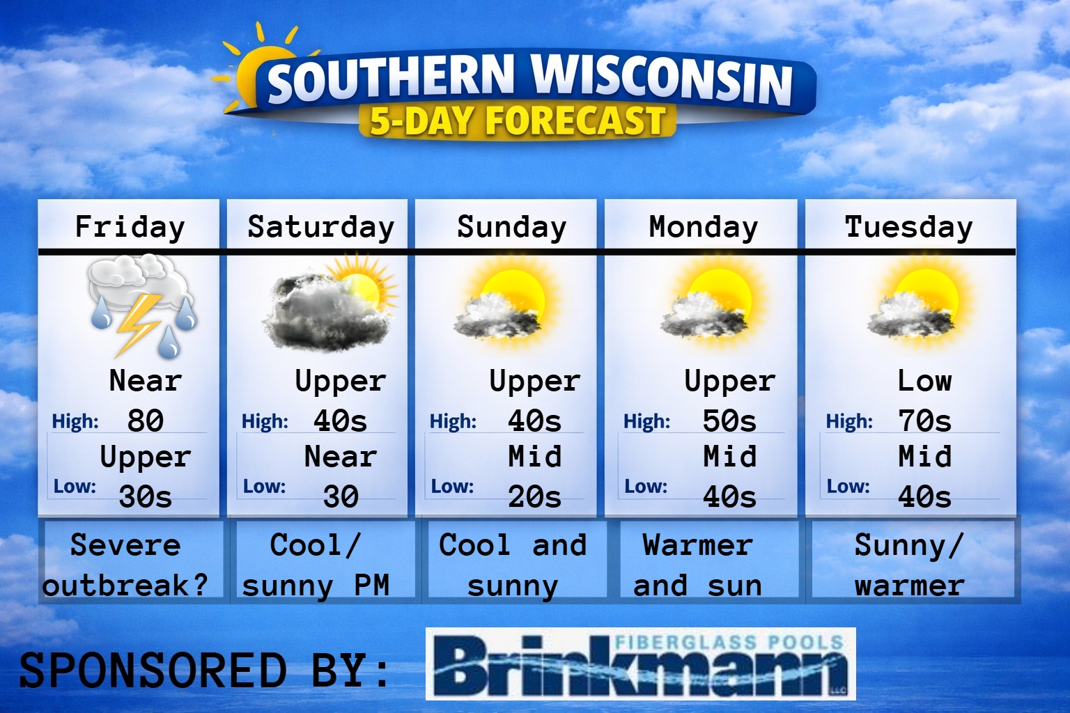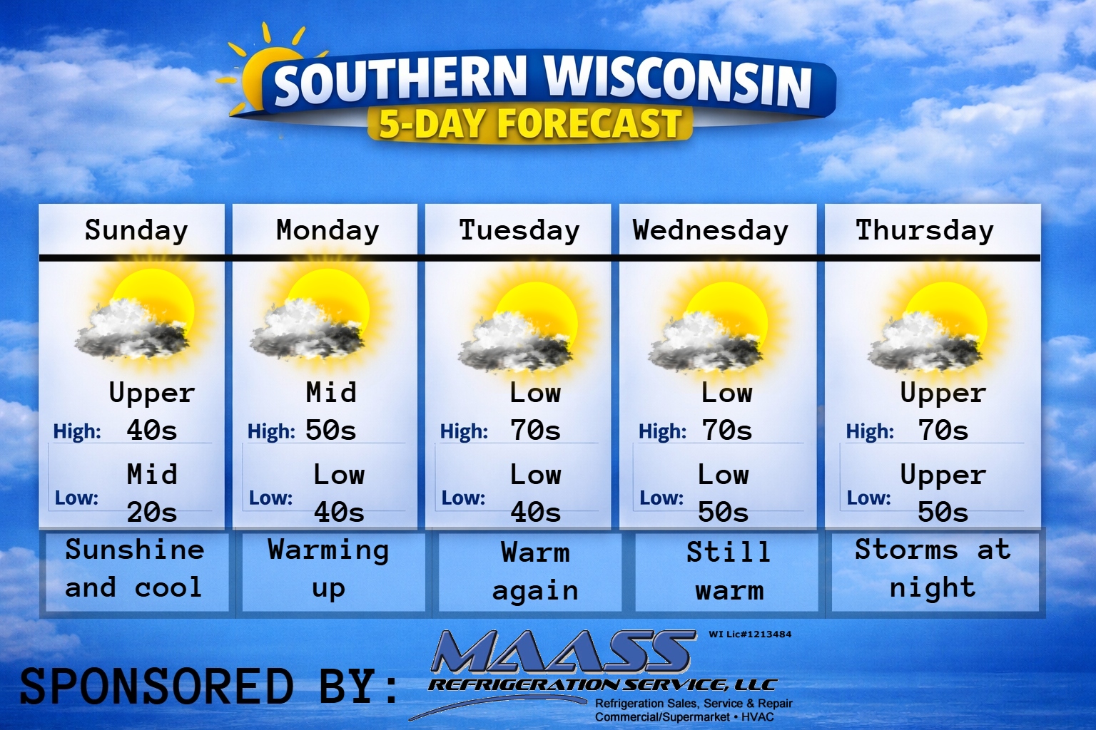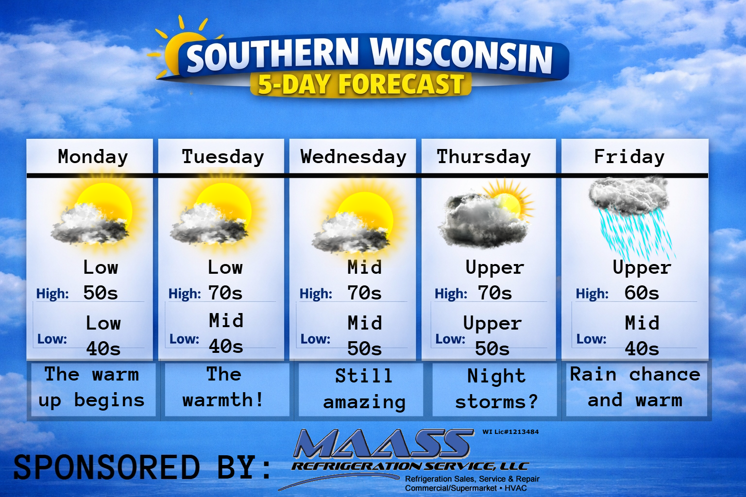This weekly Forecast is sponsored by Maass Refrigeration. 920-206-9099. info@maassrefrigeration.com. www.maassrefrigeration.com Help support my weather adventures here! THE FORECAST CURRENT CONDITIONS IN WATERLOO, WI: TIME: 615PM TEMP: 46 degrees DEWPOINT: 20 degrees WINDS: Light CURRENT CONDITIONS: Sunshine TONIGHT: TEMPS: Mid 20s WINDS: Light FORECAST: Freeze likely TOMORROW: TEMPS: Low to mid 50s WINDS: SW 4-9mph FORECAST:…