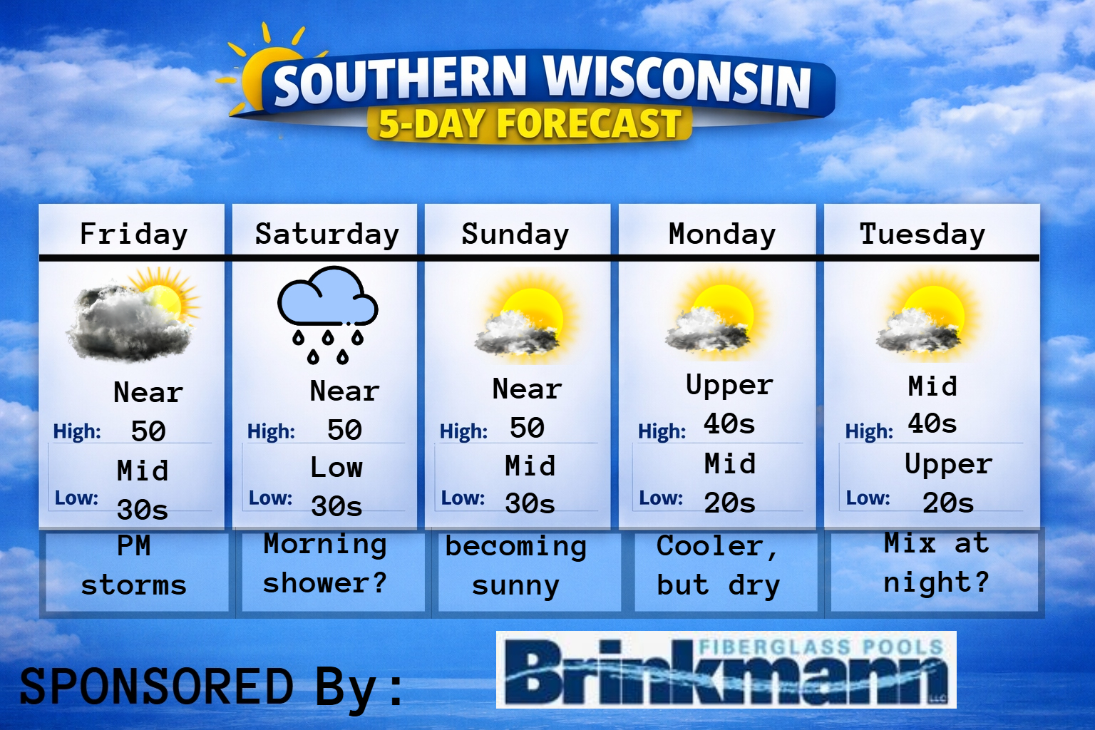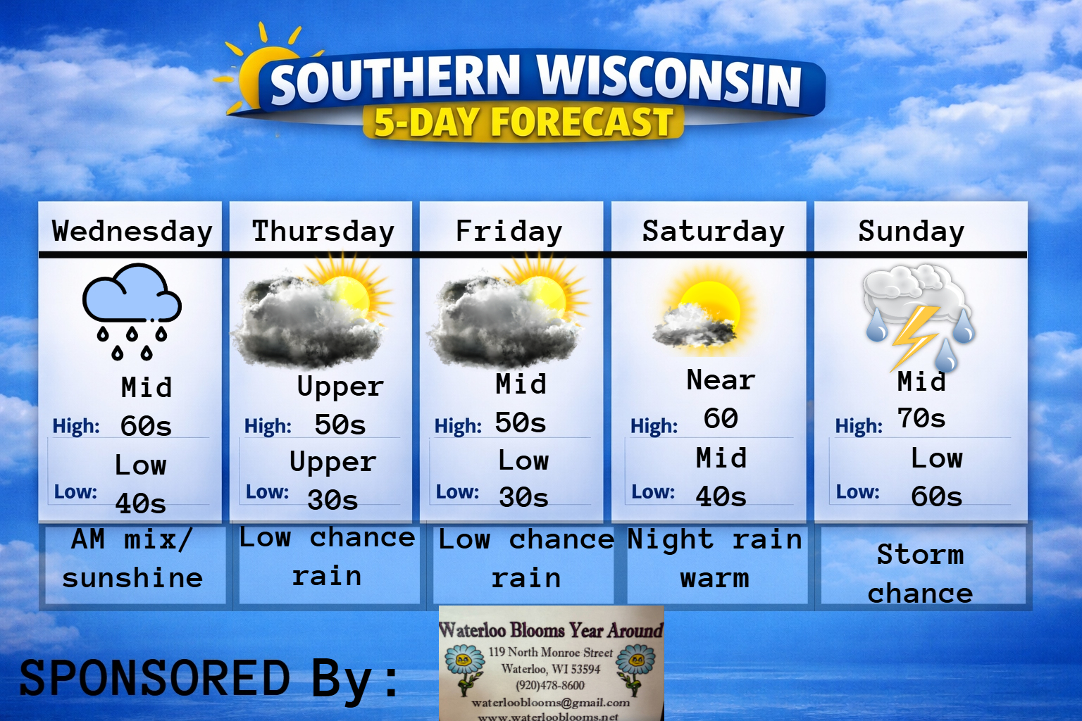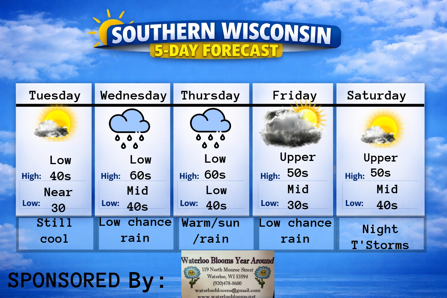 This Tuesday evening forecast is brought to you by Waterloo Blooms out of Waterloo, WI. WaterlooBlooms@gmail.com and 920-478-8600 Buy Weather Man Sam Merch My online merchandise store is now open for shopping! We have pick up spots for Lake Mills and Watertown and you can also get your orders shipped! All orders over $100 will…